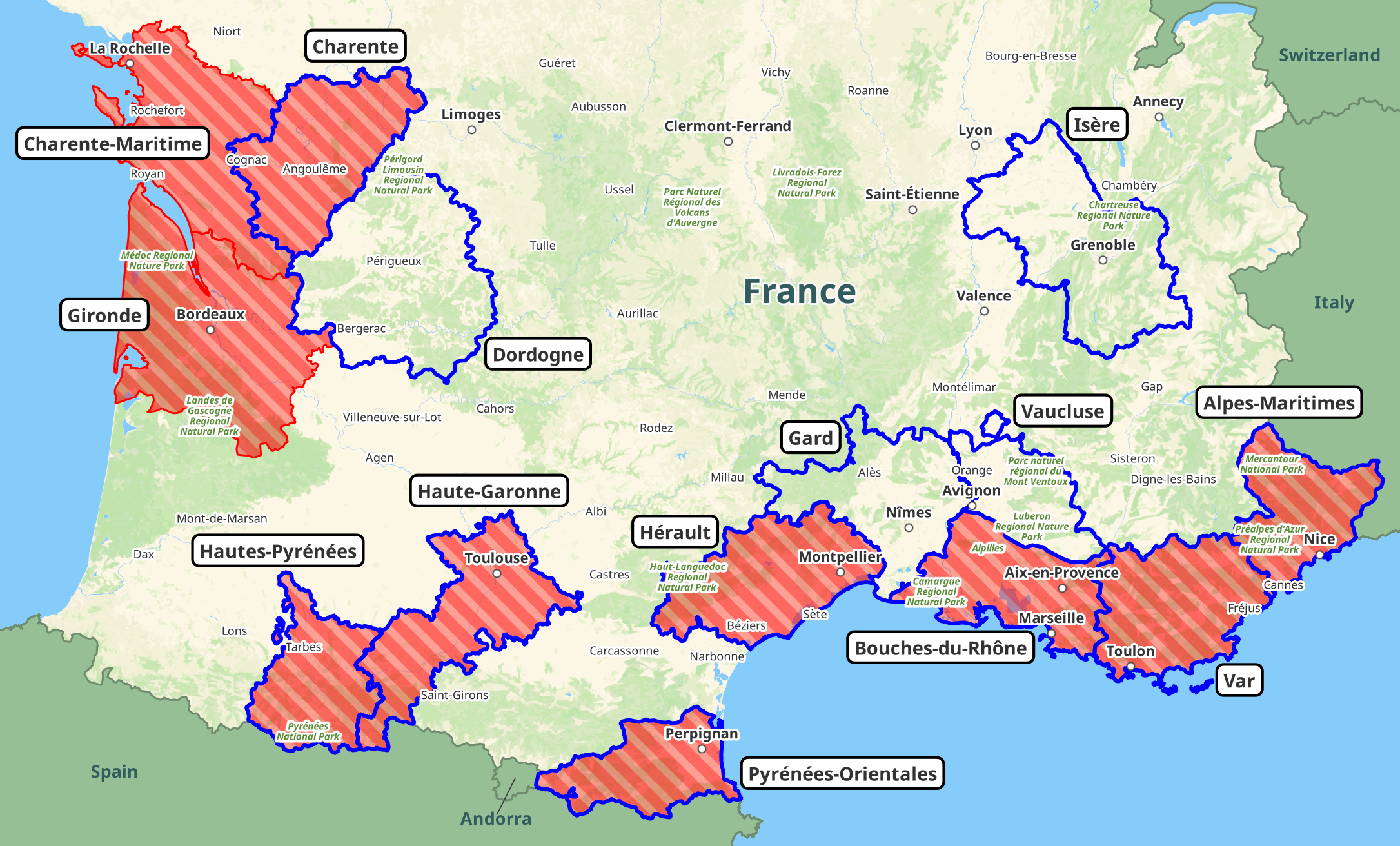 There is a tropical virus risk in the departments (regions) shown in the table below. These regions are outlined in blue on the map.