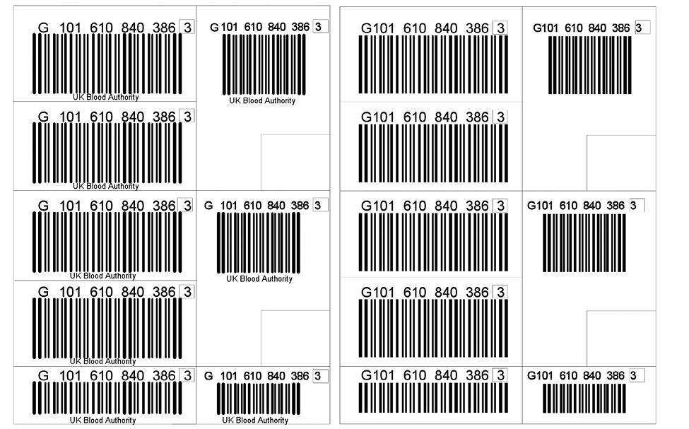 Label colour: The labels must be printed black on a white background. Where required by the ordering establishment, part of an order may incorporate a coloured stripe (usually to assist in the identification of new (first-time) donors or sample-only donations). A colour must be selected which will not interfere with the efficiency of any barcode reader in decoding essential information.
