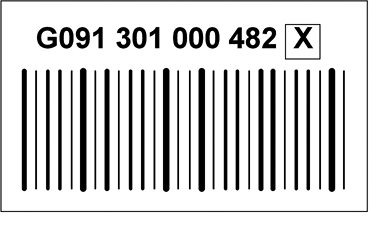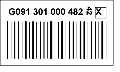 Figure 23.4 Labels showing the use of flag characters. On the left, the label shows the eye-readable format 4,3,3,3,1 layout with the check digit in a box, and on the right, the same label shows the use of the flag character