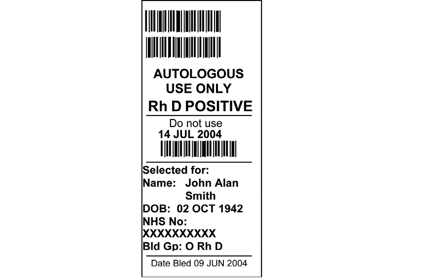 There are five status labels defined for use in the ‘blood group label’ location. The specification for these labels is divided into two sections, one for essential information which must be present on the label as specified, and one for optional information which may be added if desired.