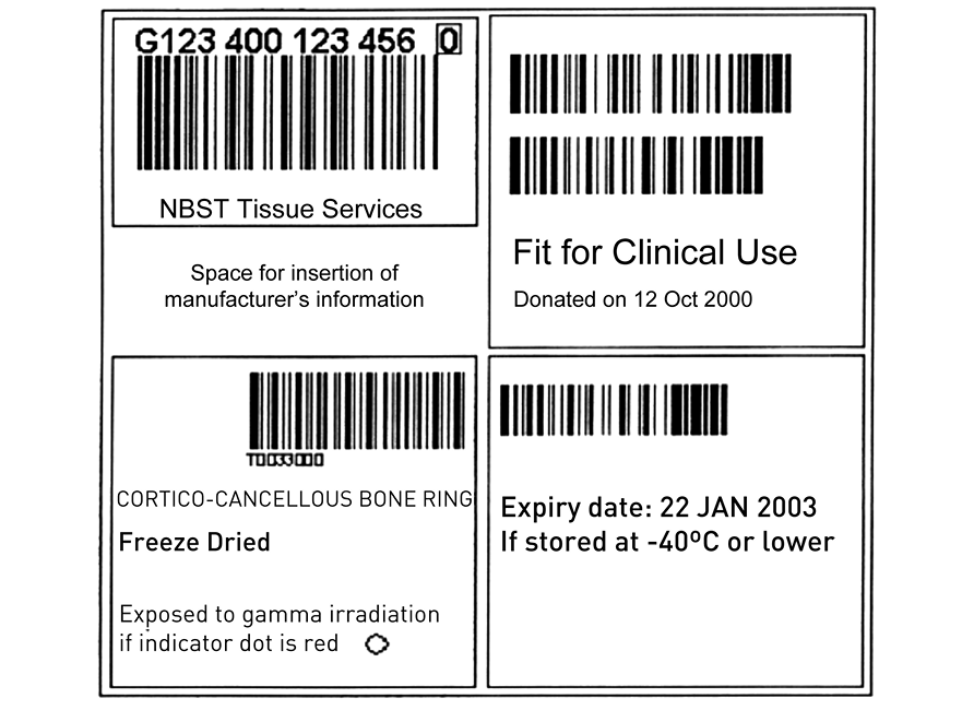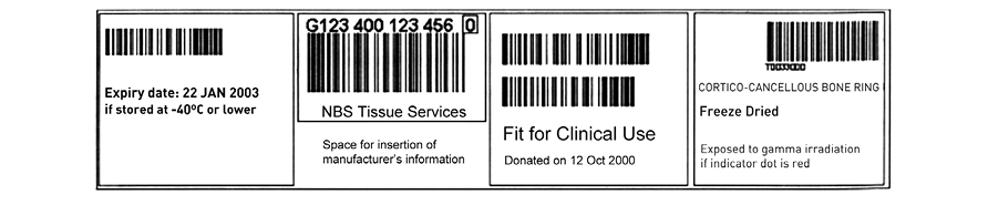 The ICCBBA ISBT 128 Technical Specification (latest version can be downloaded from the ICCBBA website www.iccbba.org) stipulates that ‘Every bar code, with the exception of the donation identification number (ICCBBA Data Structure 001), should be accompanied by an exact eye-readable representation of the data characters in the bar code’. In the UK this requirement is not being implemented for the short form unit identifier, and is currently optional for the blood group/status code and expiry date code.