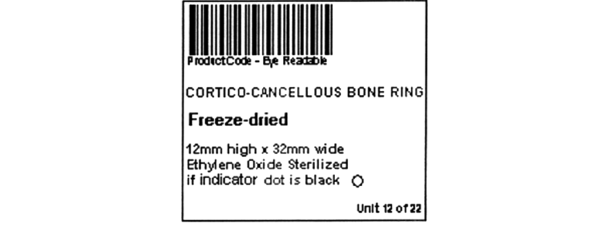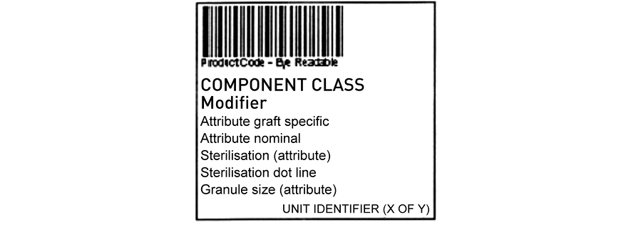 Lines 3 to 7 describe various attributes, where relevant, though one of these can be used to provide further product description information (see section 24.4.5). It is not necessary to include the unit of issue attribute details. Space will be available next to the method of sterilisation attribute where exposure ‘dots’ can be applied. The significance of the dot colour need not be detailed on the label but can be explained in the package insert. The volume/dimension field will contain either the actual or nominal tissue volume or other relevant dimensions (e.g. length, depth etc.). Immediately under the product barcode will be the unique reference number of the label which will correspond to the eye-readable barcode without the data identifier characters.