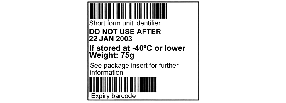 Where the expiry date label is printed as a quadrant label on its own it should also have the short form donation number barcode identifier (see section 24.3.5). This is not necessary where the label is printed as part of a status label (already including this identifier). An example of an expiry date label is shown in Figure 24.13.