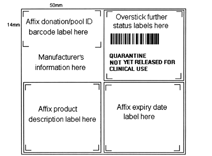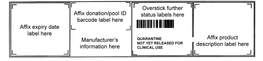 The top right-hand quadrant will be overstuck with a status label once its status has been determined (for cryopreserved products, this quadrant can be overstuck with a ‘See outer container for product status’ label). The status label can then be applied to a secondary container.