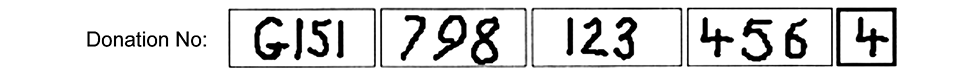The full eye-readable donation identification number, including check character, must be recorded and entered in all cases. The use of pre-programmed shortcut keys (‘hot’ keys) or pre-printing of part of a number is not acceptable.